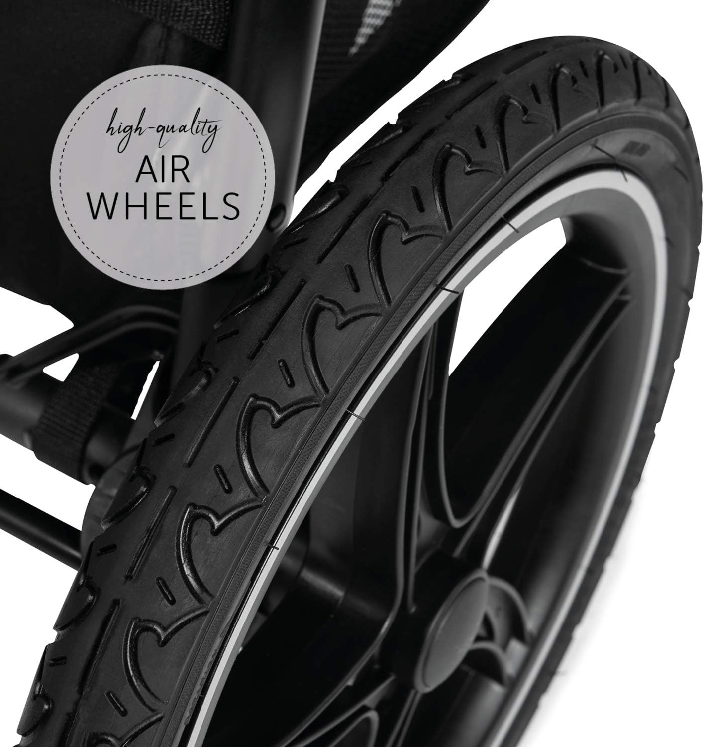- All-terrain: The robust three-wheel stroller with extra-large air wheels and swivelling / lockable front wheel is suitable for city and country and has plenty of storage space in the basket up to 3 kg