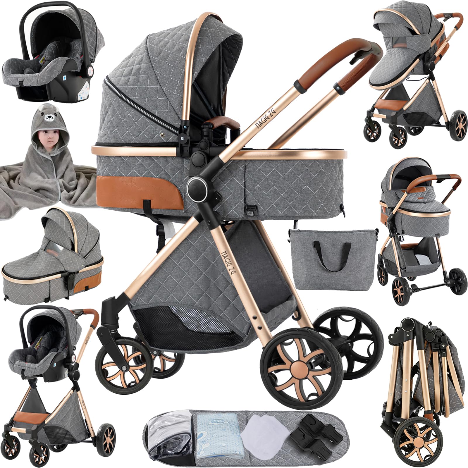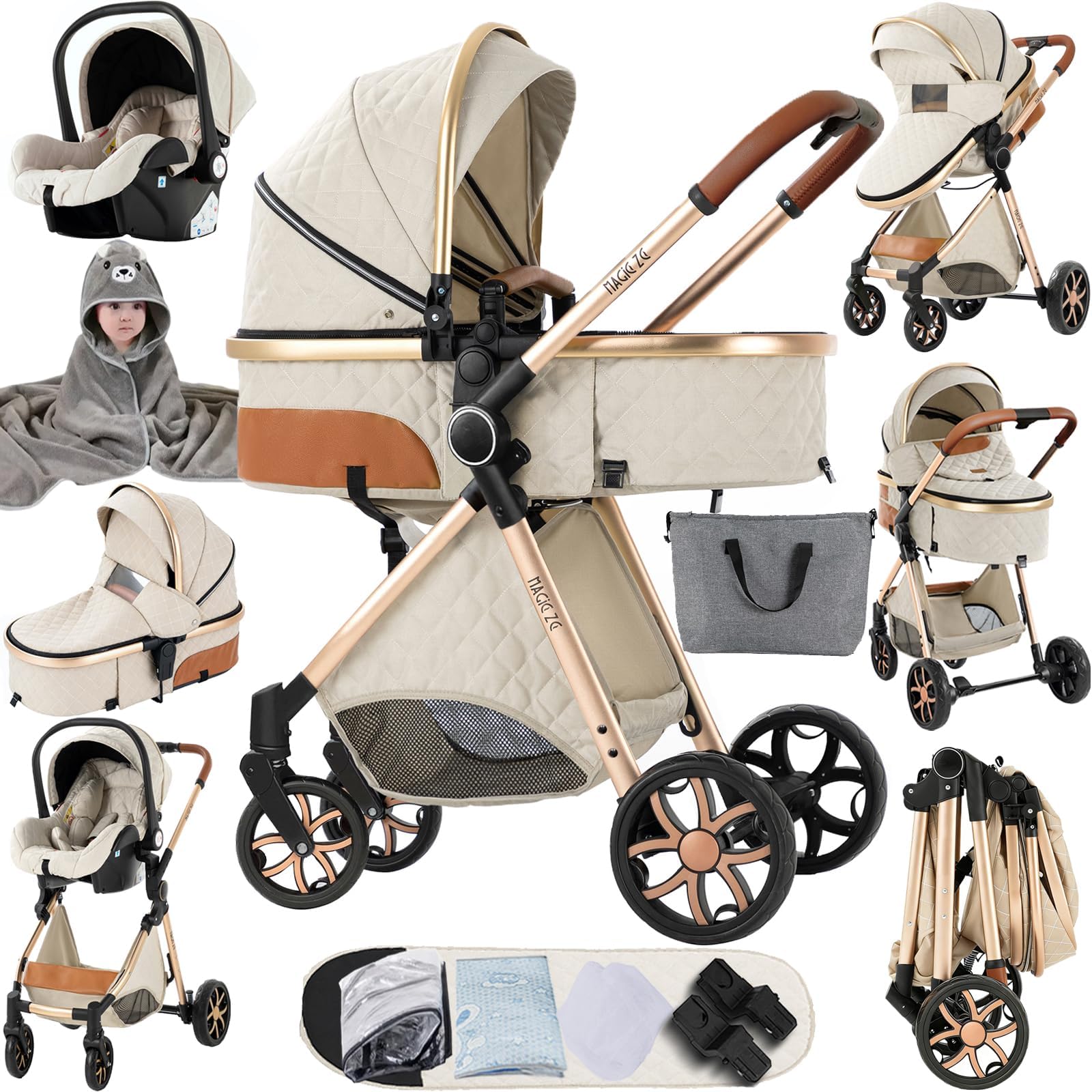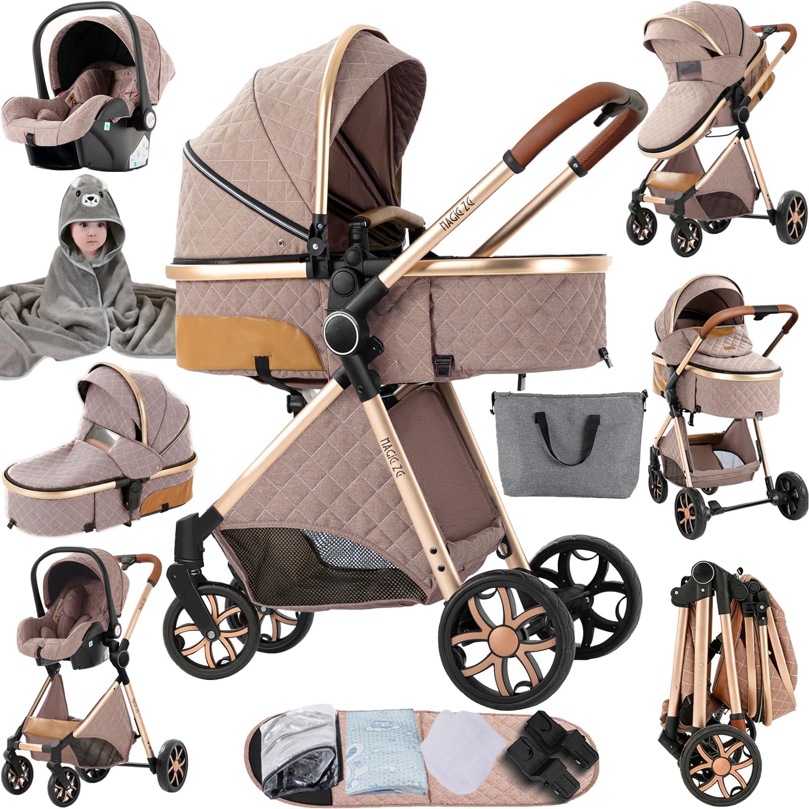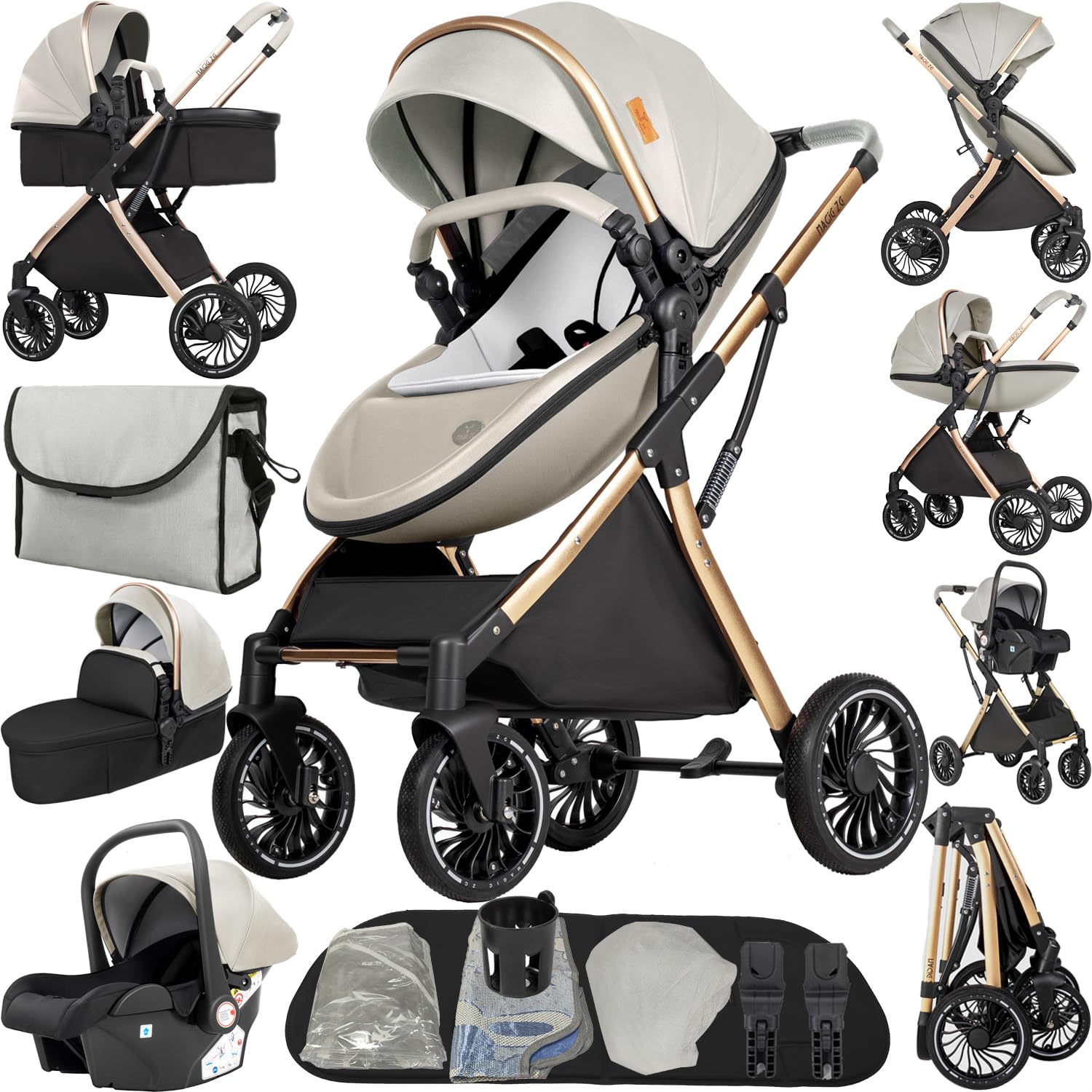 Magic ZC 3 in 1 Pushchair Pram Travel System Baby Stroller Reversible Foldable Aluminium Frame Newborn to Toddler Khaki 518